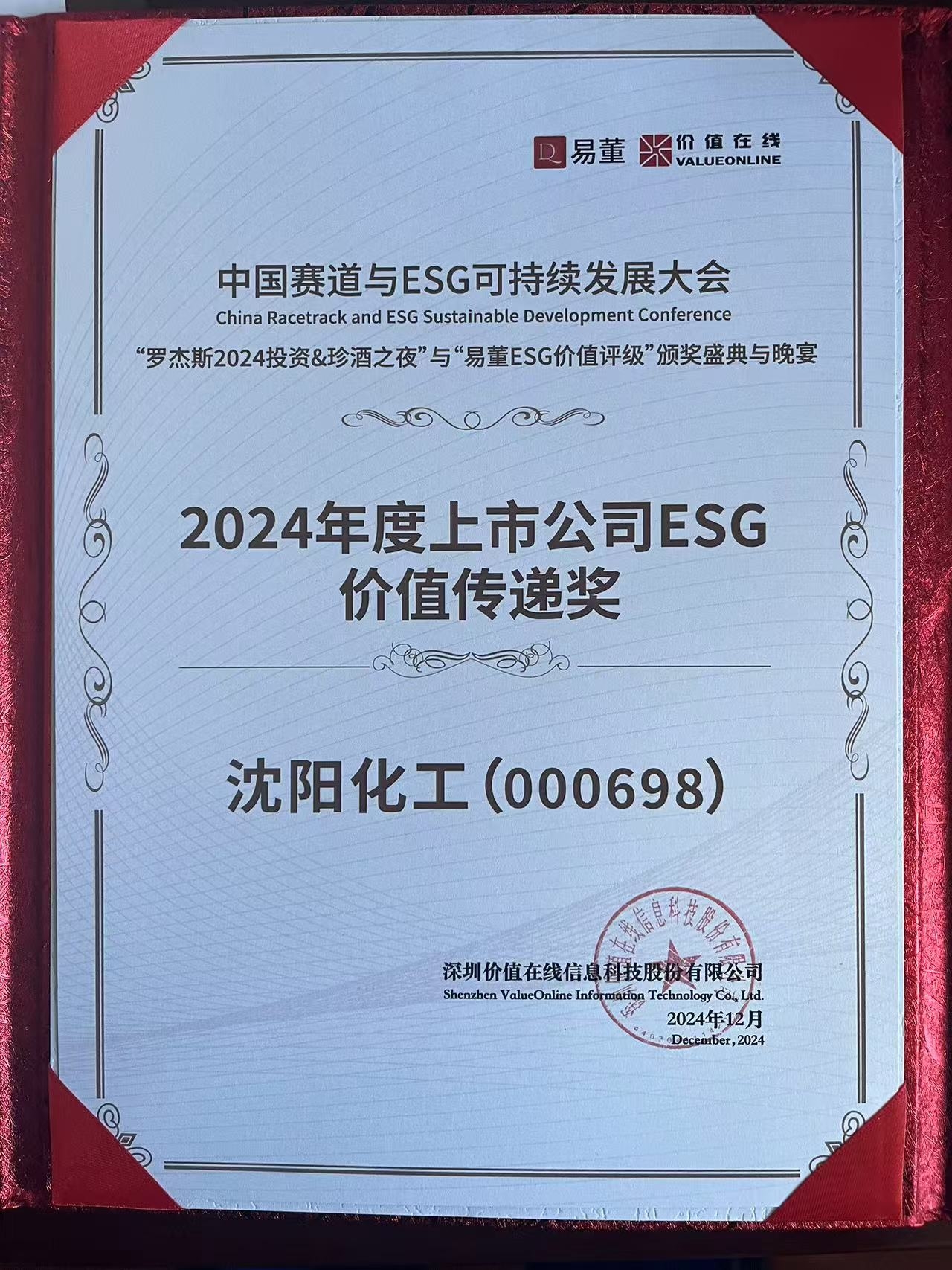 12月7日—8日,由價(jià)值在線和亞洲商務(wù)大學(xué)堂主辦,以“投資光明,共創(chuàng)未來(lái)”為主題的“中國(guó)賽道與ESG可持續(xù)發(fā)展大會(huì)”在深圳市光明區(qū)召開。數(shù)百家上市企業(yè)代表云集,聚焦綠色創(chuàng)新,共同探索經(jīng)濟(jì)高質(zhì)量發(fā)展路徑。大會(huì)發(fā)布2024年度易董ESG+8“價(jià)值100榜單”,沈陽(yáng)化工股份有限公司(以下簡(jiǎn)稱“沈陽(yáng)化工”)憑借其在環(huán)境、社會(huì)及公司治理(ESG)領(lǐng)域的卓越表現(xiàn),成功榮獲這一殊榮。此前,沈陽(yáng)化工已獲得“國(guó)新杯·ESG金牛獎(jiǎng)”,此次獲獎(jiǎng)為沈陽(yáng)化工于本年度在ESG工作領(lǐng)域收獲的第二大獎(jiǎng)項(xiàng)。